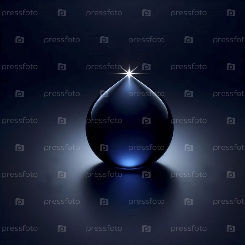 Капля сапфирово-синего масла на черном полированном мраморе, отражающая один яркий студийный свет как белая звезда, Ai создала изображение