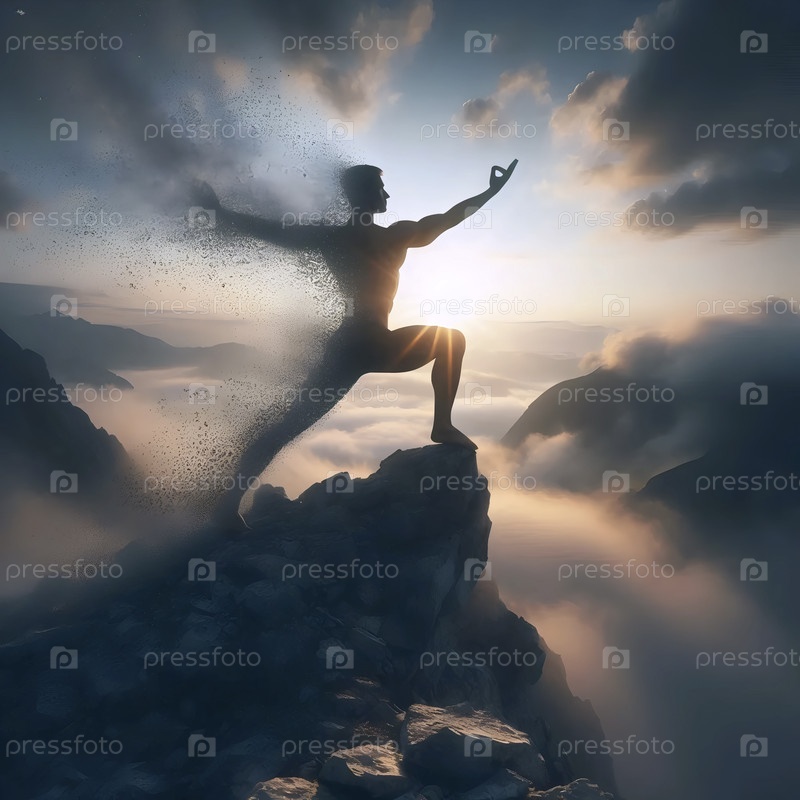 Практикующий йогу в позе воина на горном хребте с краями тела, растворяющимися в туманном пейзаже, становясь одним из элементов, Ai generated image