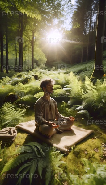 Практикующий эко-йогу сидит в медитации на естественном ютовом ковре в солнечном лесу, окруженный папоротниками, Ai generated image