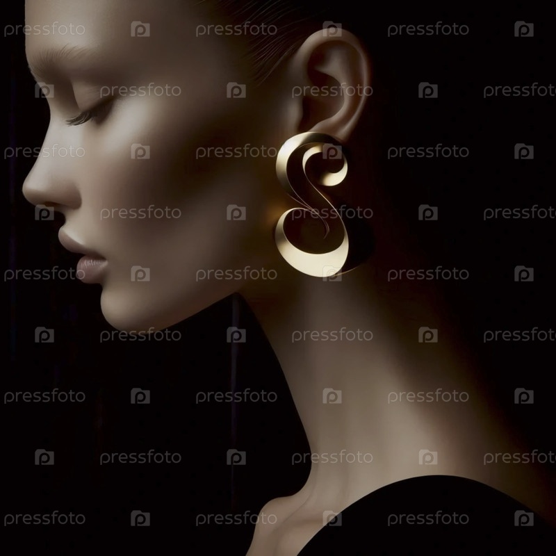 Профиль женского уха с большой, скульптурной золотой серёжкой на черном фоне Ai generated image