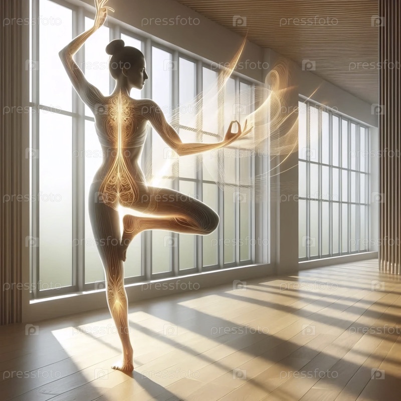 Практикующий нейрофитнес рисует ленивого слона в воздухе во время позы на дереве в солнечной минималистической студии, Ai generated image