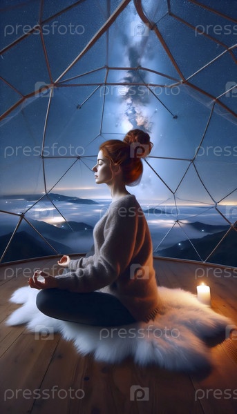 Практикующий йогу в мирной медитации внутри кристаллического геодезического купола под звездным ночным небом, Ai generated image