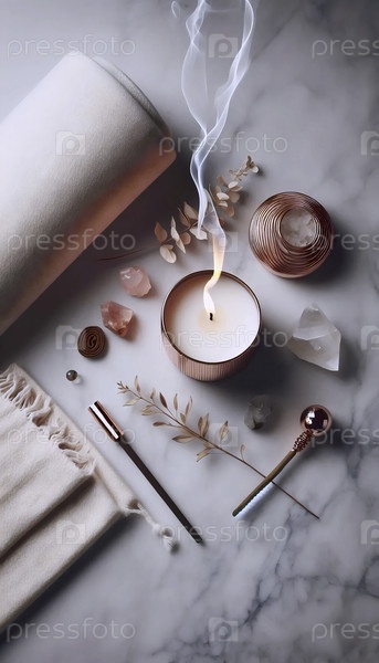 Плоская композиция реквизитов йоги со свечой из розового золота и спиральным дымом фимиама на мраморной поверхности, Ai generated image
