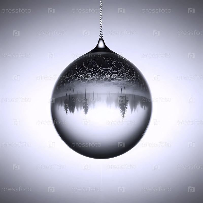 Капля росы, висящая от одной нитки шелкового паука против туманной белой пустоты, крошечный перевернутый мир внутри, Ай создал изображение