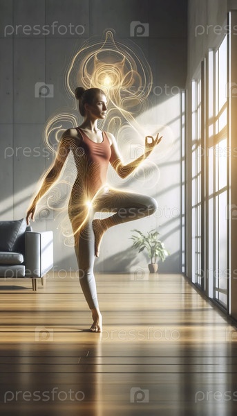 Практикующий нейрофитнес рисует ленивого слона в воздухе во время позы на дереве в солнечной минималистической студии, Ai generated image
