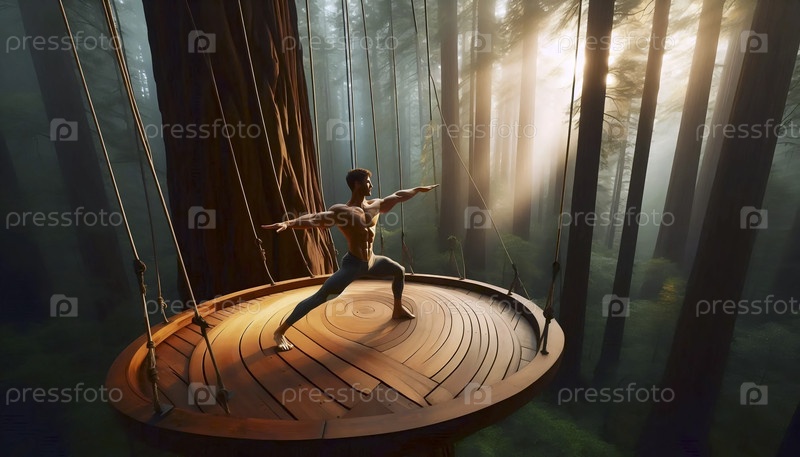 Практикующий йогу воин II позирует на деревянной платформе, подвешенной среди секвойев, Ai generated image