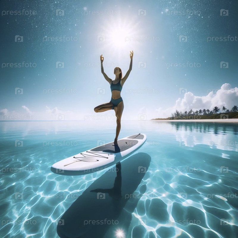Практикующий йогу SUP в идеальной деревянной позе на подлодке плавает над кристально чистой бирюзовой водой, Ai generated image