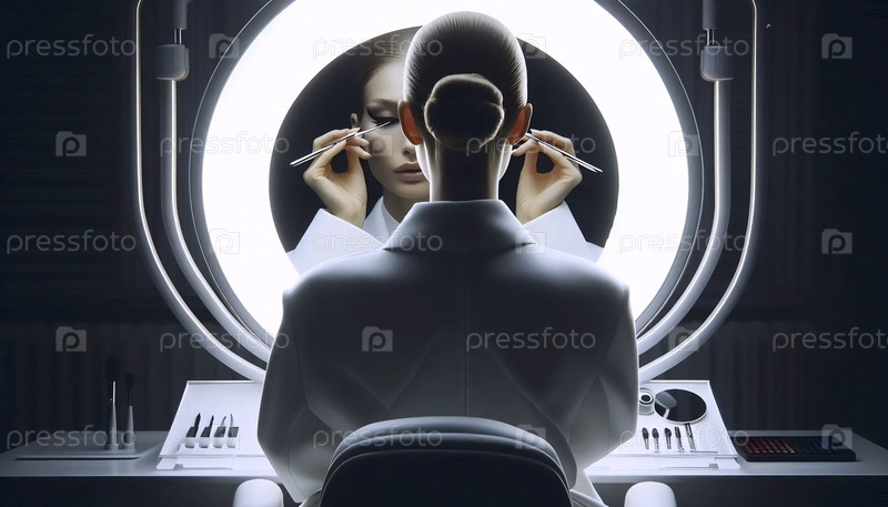 Вид над плечом модели в белом пальто, наносящей капли росы пинцетом, увиденный в зеркале, Ai generated image