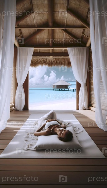 Спокойная релаксация йоги в тропическом пляжном бамбуковом павильоне, Ai generated image