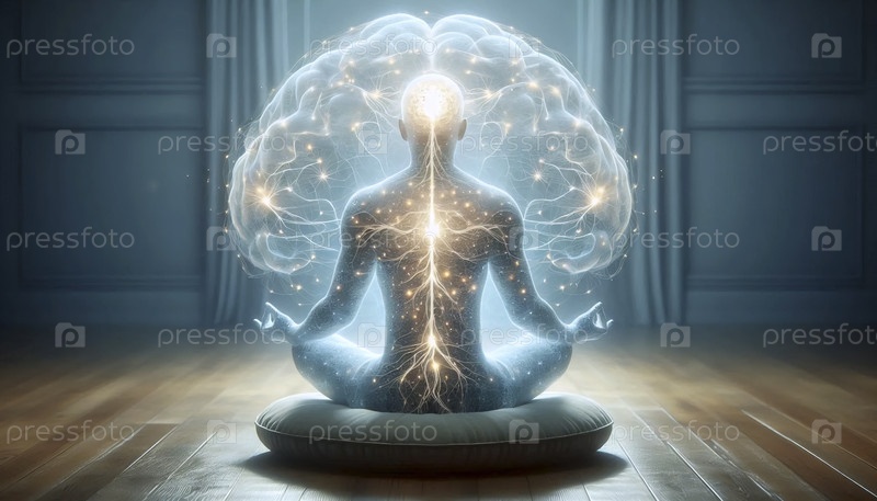Нейрофитнес-практикующий с сияющими нейронными сетями вокруг головы во время сидячей медитации, Ai generated image