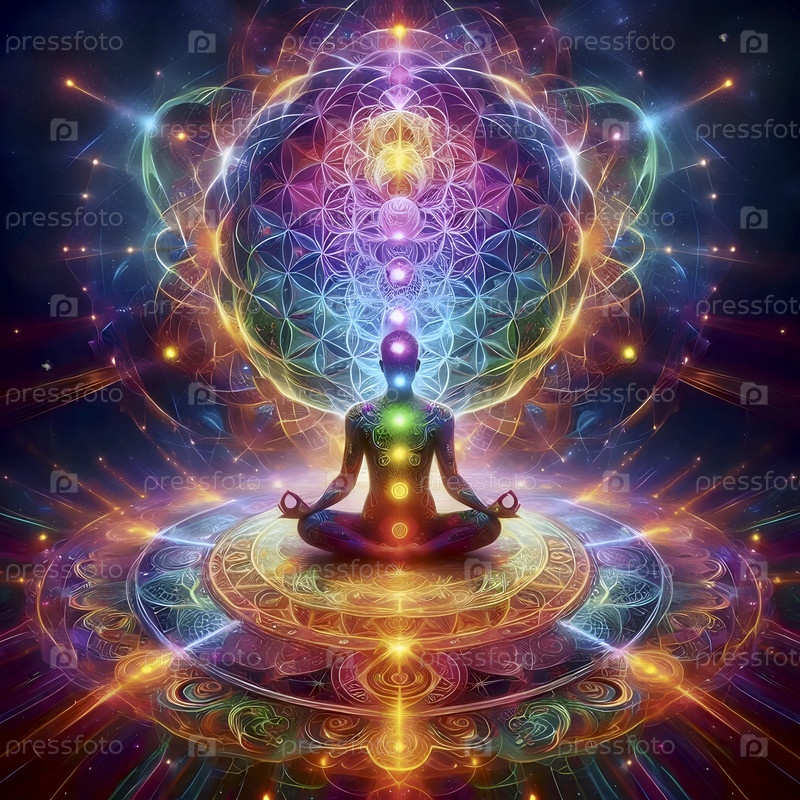 Практикующий йогу в лотосе позирует в центре светящейся космической мандалы с волнами энергии чакры, сливающейся со священной геометрией, Ai generated image