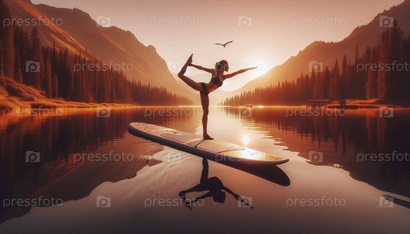 Практикующий йогу SUP в Warrior III позирует на борту над спокойным горным озером в золотое время, Ai generated image
