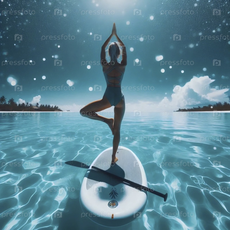 Практикующий йогу SUP в идеальной деревянной позе на подлодке плавает над кристально чистой бирюзовой водой, Ai generated image