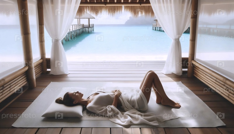 Спокойная релаксация йоги в тропическом пляжном бамбуковом павильоне, Ai generated image