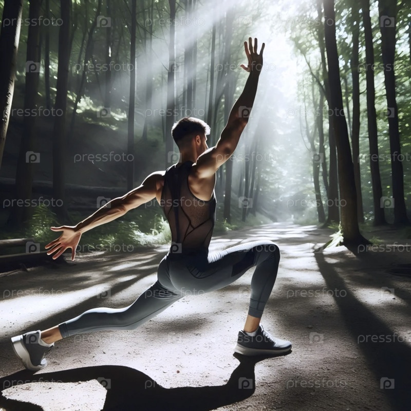 Ходящий практикующий йогу в глубоком прыжке на тропе под солнцем, окруженной высокими деревьями, Ai generated image