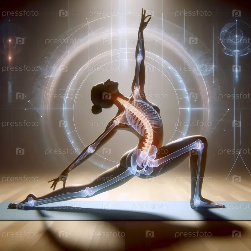 Умный практикующий йогу в позе треугольника с голографическим скелетным перекрытием, показывающим выравнивание позвоночника и углов суставов, Ai generated image