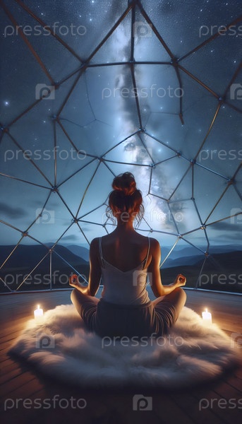 Практикующий йогу в мирной медитации внутри кристаллического геодезического купола под звездным ночным небом, Ai generated image