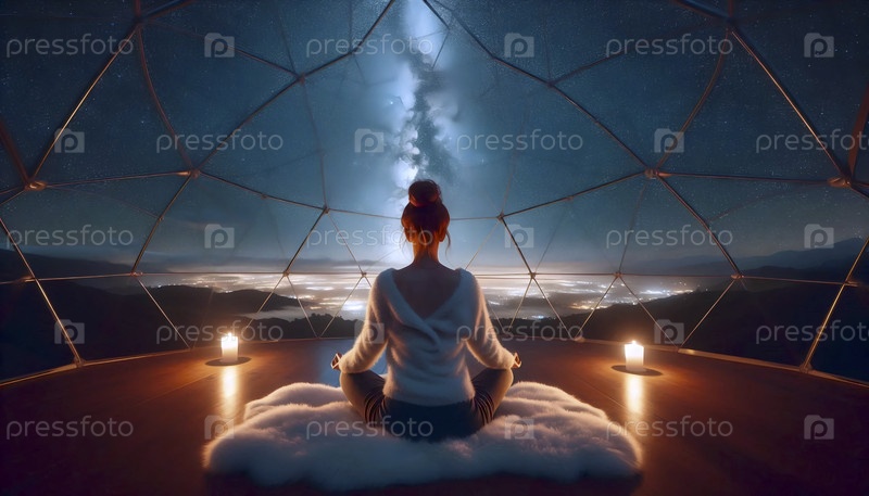 Практикующий йогу в мирной медитации внутри кристаллического геодезического купола под звездным ночным небом, Ai generated image