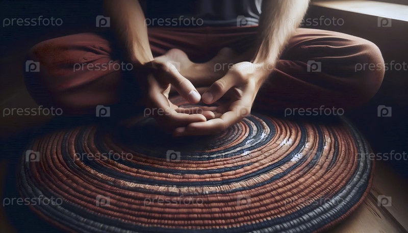 Ближайший план рук в Gyan Mudra на текстурированной медитационной подушке, Ai generated image