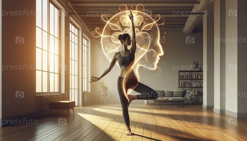 Практикующий нейрофитнес рисует ленивого слона в воздухе во время позы на дереве в солнечной минималистической студии, Ai generated image