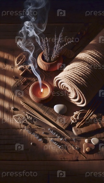 Плоская композиция угловой йоги-матки с терракотной свечой и дымовыми следами в теплом закате на дереве, Ai generated image
