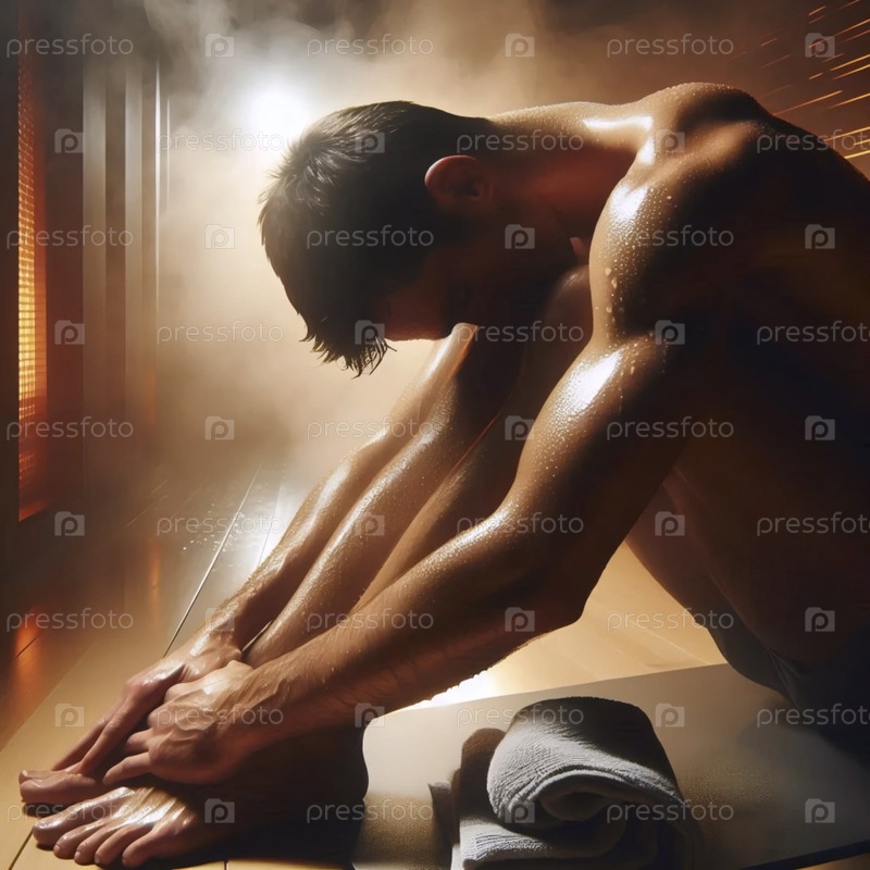 Горячий практикующий йогу в сидящей передней складке капает от пота в заполненной парами инфракрасной нагреваемой студии, Ai generated image