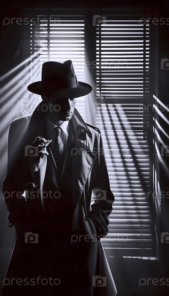 Мужчина в федоре, освещенный сзади шаблоном жалюзи для окон, лицо во тьме за исключением сигаретного фонаря, Ai generated image