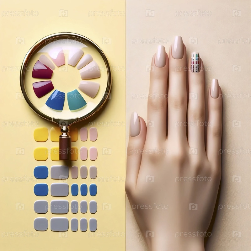 Графический плоский набор полос ногтевого лака рядом с рукой, а вырезанное увеличительное стекло показывает идеальное применение, Ai создал изображение
