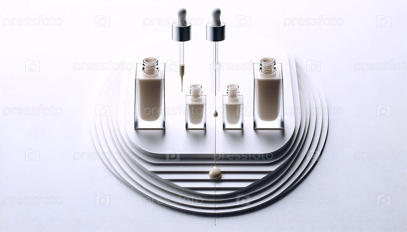 Плоский слой из четырех бутылок с капсулами, каждая из которых капает точкой на полоску градиента цвета кожи, Ai создал изображение