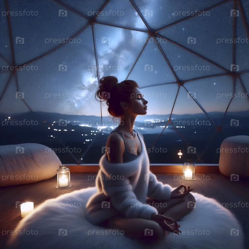 Практикующий йогу в мирной медитации внутри кристаллического геодезического купола под звездным ночным небом, Ai generated image