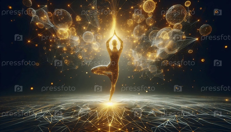 Практикующий йогу в позе на дереве с корнями, превращающимися в светящиеся геометрические узоры и восходящие частицы света, Ai generated image