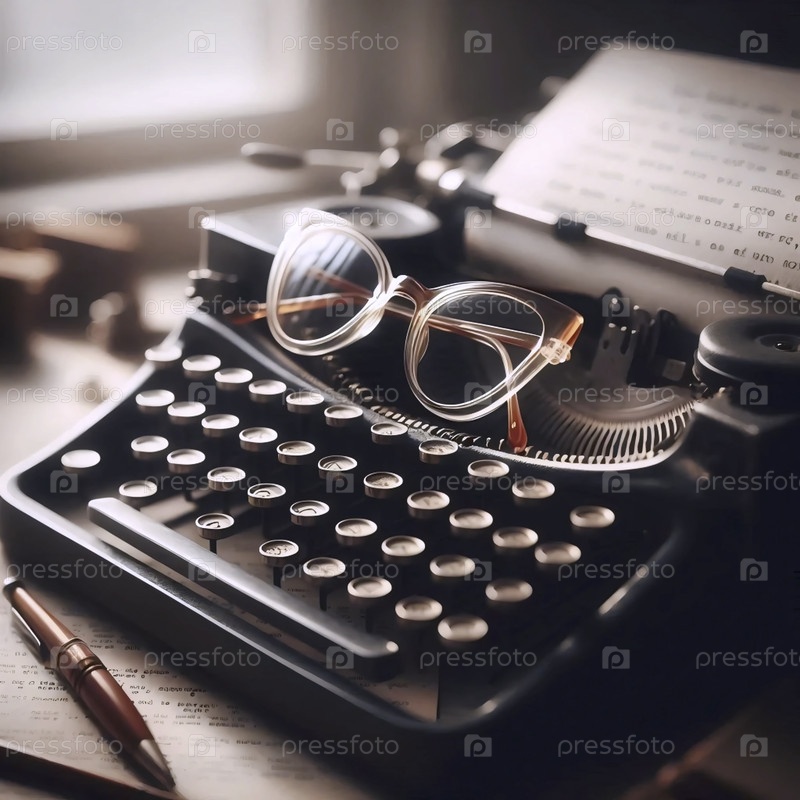 Пара очков для кошачьих глаз, опираясь на открытую пишущую машинку с листом бумаги, содержащей стихотворение, Ай создала изображение