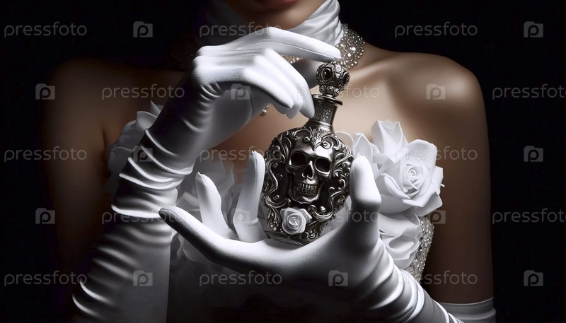 Ближайший план женских рук в оперных перчатках, один держит деликатную ядовитую бутылку, Ai generated image