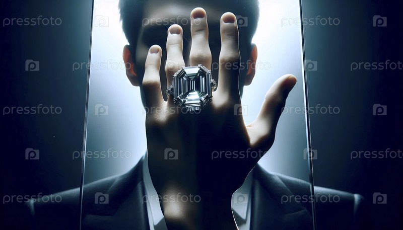 Одно массивное кольцо коктейля на пальце модели, ее рука прижата к стеклу, Ай создала изображение