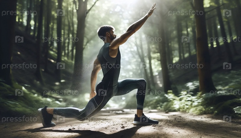 Ходящий практикующий йогу в глубоком прыжке на тропе под солнцем, окруженной высокими деревьями, Ai generated image