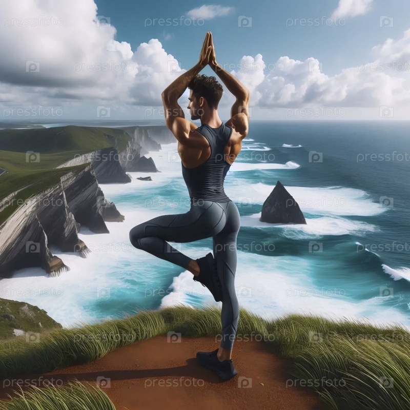 Ходящий практикующий йогу в стоячем спинном наклоне на прибрежной скале с видом на бурные океанские волны, Ai generated image