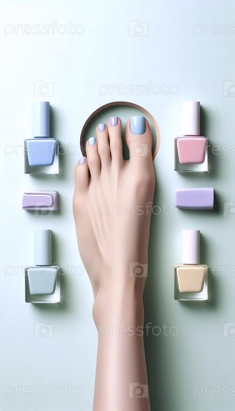 Графический плоский слой из пяти пастельных бутылок лака на ногтях, выравниваемых с вентилятором совпадающих ухоженных пальцев, Ai создал изображение