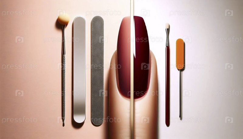 Реклама маникюра на разделенном экране: инструменты против результата, отделены золотым слитком, Ai generated image