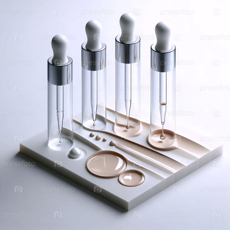Плоский слой из четырех бутылок с капсулами, каждая из которых капает точкой на полоску градиента цвета кожи, Ai создал изображение