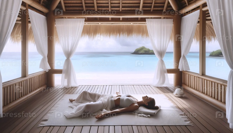 Спокойная релаксация йоги в тропическом пляжном бамбуковом павильоне, Ai generated image