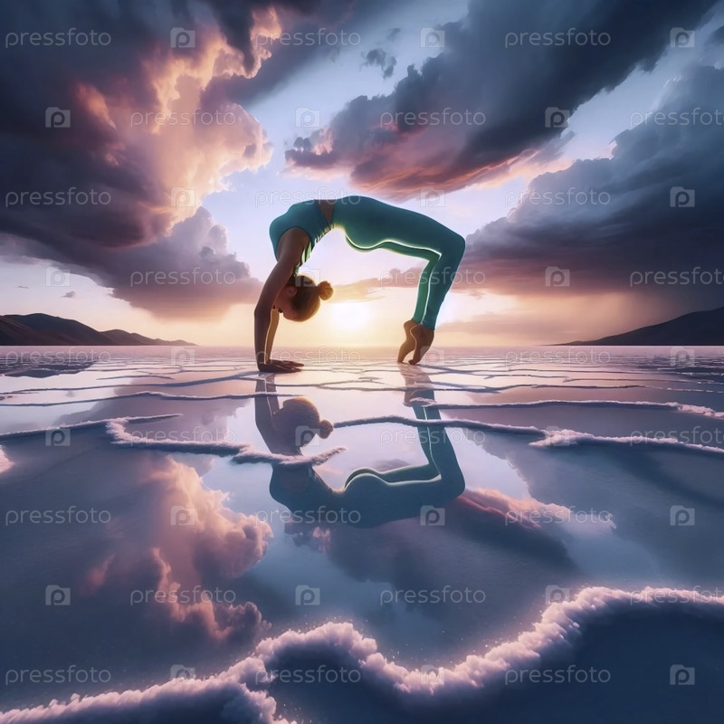 Практикующий йогу в позах на рефлекторной соленой плоскости под драматическим облачным небом, Ai generated image