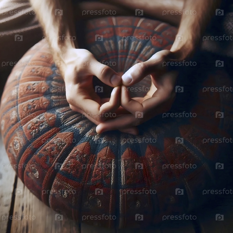 Ближайший план рук в Gyan Mudra на текстурированной медитационной подушке, Ai generated image