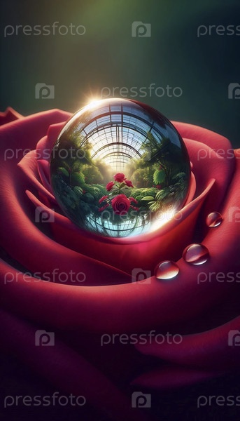 Капля дождя на листье пурпурной розы, отражающая всю теплицу в миниатюрном мире, Ай создала изображение