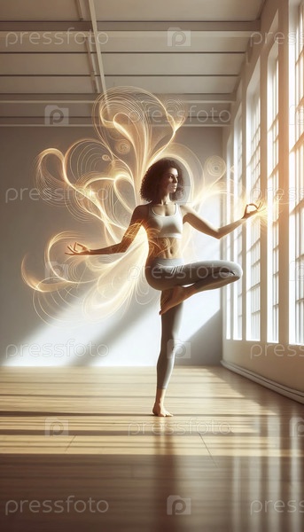 Практикующий нейрофитнес рисует ленивого слона в воздухе во время позы на дереве в солнечной минималистической студии, Ai generated image