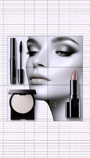 Плоская полоса головоломки лица: косметические изделия рядом с круглыми вырезками их применения, Ai generated image