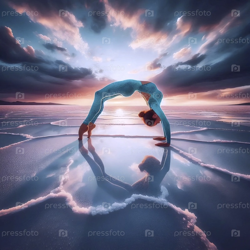 Практикующий йогу в позах на рефлекторной соленой плоскости под драматическим облачным небом, Ai generated image