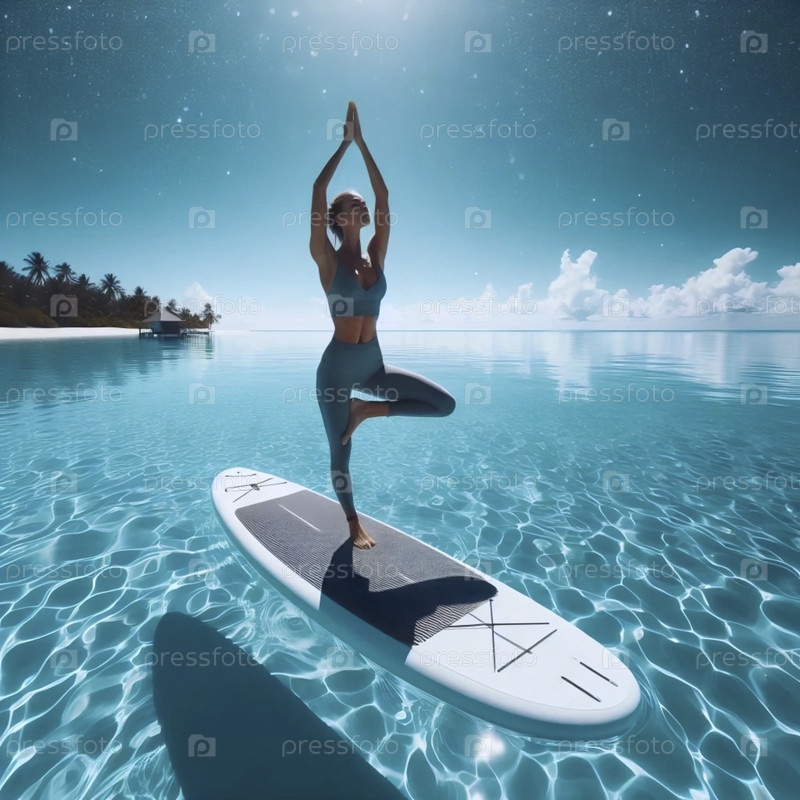 Практикующий йогу SUP в идеальной деревянной позе на подлодке плавает над кристально чистой бирюзовой водой, Ai generated image