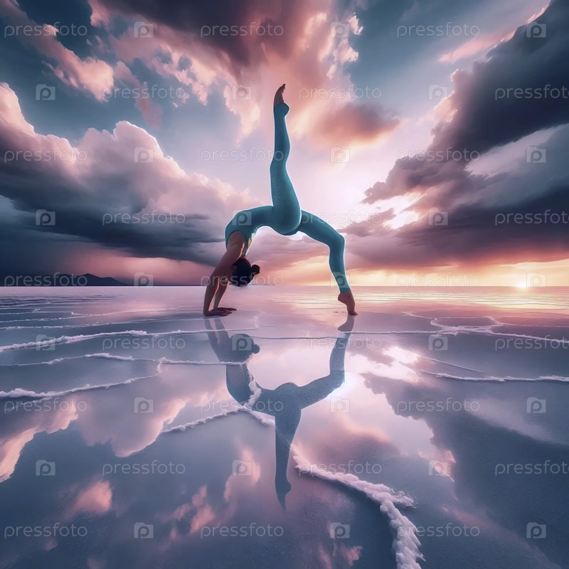 Практикующий йогу в позах на рефлекторной соленой плоскости под драматическим облачным небом, Ai generated image
