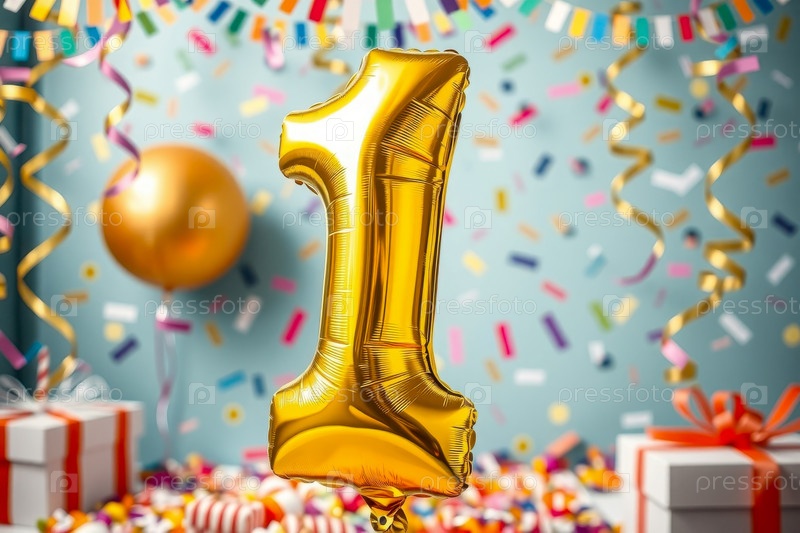 Гелиевый баллон рождения формы номер один, фигура золотой буквы 1 на праздновании праздничный фон