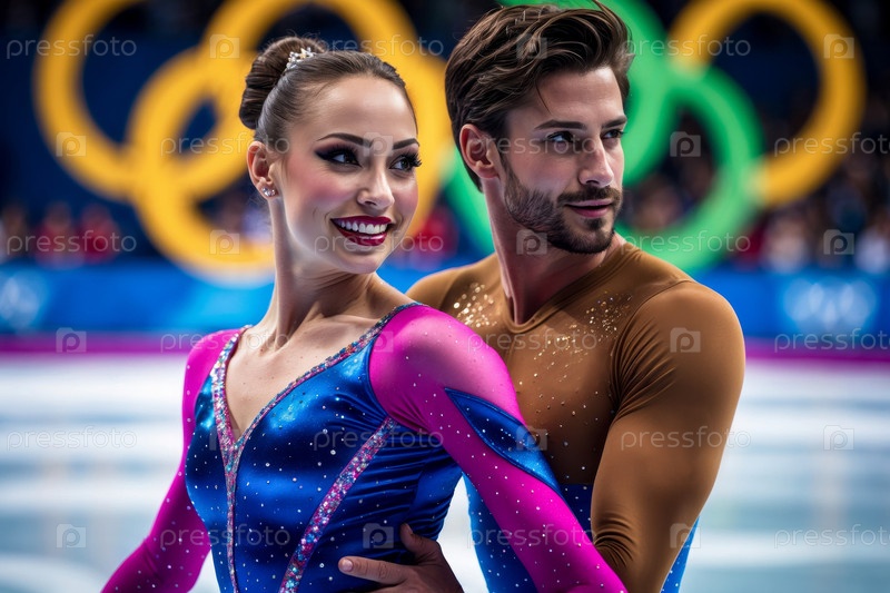 AI Generative Женщины и мужчины лыжники катаются на коньках, зимние Олимпийские игры пара фигурное качение соревнование